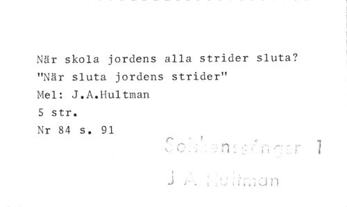 //// När skola jordens alla strider sluta? "När sluta jordens strider" //// Mel: J.A.Hultman //// 5 str. //// Nr 84 s. 91 ////