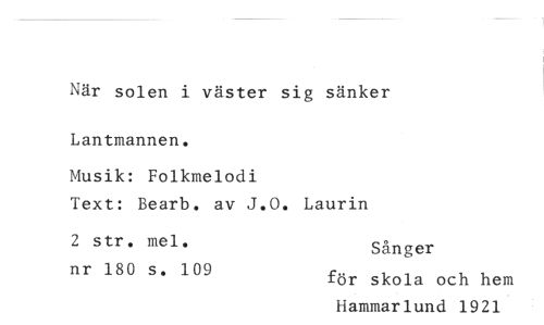 //// När solen i väster sig sänker Lantmannen. //// Musik: Folkmelodi //// Text: Bearb. av J.O. Laurin //// 2 str. mel. Sånger //// nr 180 s. 109 för skola och hem //// Hammarlund 1921 ////