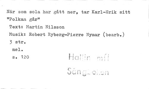 //// När som sola har gått ner, tar Karl-Erik sitt "Polkan går" //// Text: Martin Nilsson //// Musik: Robert Ryberg-Pierre Nymar (bearb.) 3 str. //// mel. //// s. 120 //// Jun ////