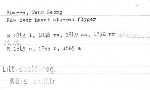 //// Sparre, Pehr Georg //// När över havet stormen flyger //// /9/514J //// R 1845 a, 1859 b, 1865 a //// E 1843 1, 1848 vv, 1849 ss, 1852 rr (R8tit-019). //// -reg, //// KB:s s ////