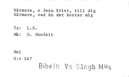 //// Närmare, o Jesu Krist, till dig Närmare, vad än det kostar mig //// Tx: L.S. //// Mk: 0. Ahnfelt //// Mel //// N:r 567 //// Bibeltr Vs Sångb Mus ////
