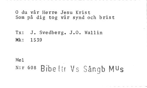 //// 0 du vår Herre Jesu Krist //// Som på dig tog vår synd och brist //// Tx: J. Svedberg. J.O. Wallin Mk: 1539 //// Mel //// N:r 608 Bibe Ett Vs Sångb Mus ////