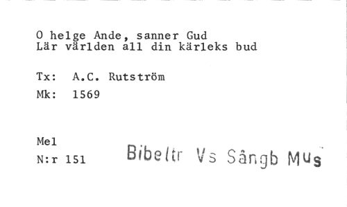 //// 0 helge Ande, sanner Gud //// Lär världen all din kärleks bud //// Tx: A.C. Rutström Mk: 1569 //// Mel Bibeltr Sångb Mus //// N:r 151 ////