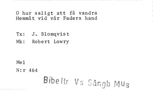 //// 0 hur saligt att få vandra //// Hemmåt vid vår Faders hand //// Tx: J. Blomqvist Mk: Robert Lowry Mel //// N:r 464 //// Bibeltr Vs Sår,gb mus, ////