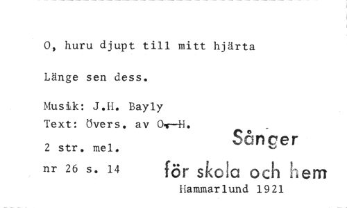 //// huru djupt till mitt hjärta Länge sen dess. //// Musik: J.H. Bayly Text: övers. av OK—H. //// S //// 2 str. ånger //// nr 26 s. 14 för skola och hem //// Hammarlund 1921 ////
