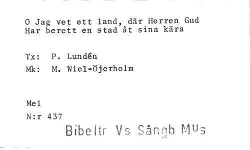 //// 0 Jag vet ett land, där Herren Gud Har berett en stad åt sina kära //// Tx: P. Lund6n //// Mk: M. Wiel-Öjerholm //// Mel //// N:r 437 //// Bibeitr Vs Sånrib Muss ////