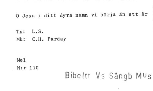 //// 0 Jesu i ditt dyra namn vi börja än ett år //// Tx: L.S. //// Mk: C.H. Parday //// Mel //// N:r 110 //// Bibettr tis Sångb Mus ////