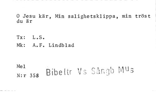 //// 0 Jesu kär, Min salighetsklippa, min tröst i du är //// Tx: L.S. //// Mk: A.F. Lindblad //// Mel betr Itr V s Sån (11) Mus //// N:r 358 B ////