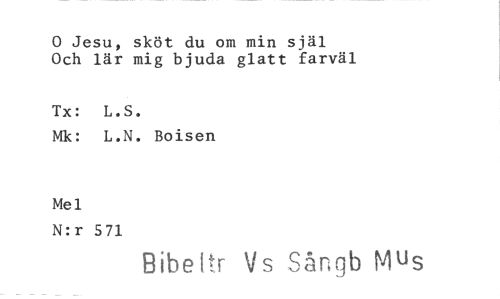 //// 0 Jesu, sköt du om min själ Och lär mig bjuda glatt farväl //// Tx: L.S. //// Mk: L.N. Boisen //// Mel //// N:r 571 //// Bibeltr Vs Sångb Mus ////