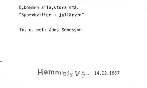 //// 0,kommen alla,stora små. "Sparvkvitter i julkärven" //// Tx. o. mel: Jöns Sonesson //// Hemmat Vhl ... 14.12.1967 ////