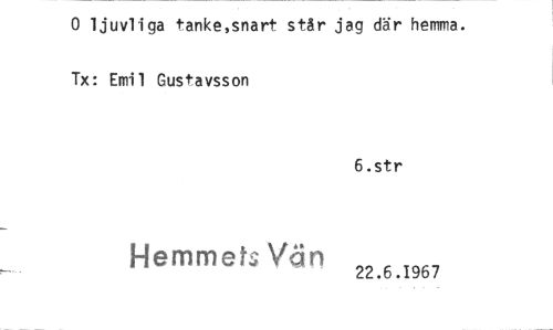 //// 0 ljuvliga tanke,snart står jag där hemma. Tx: Emil Gustavsson //// 6.str //// Hemmet:, Vä 22.6.1967 ////