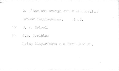 //// 0, lätom oss svärja et J fostbrödrelag //// 3vensk 4 s'4 //// "7' C. v, Zeipel. //// J,E, Nordblout //// Skir:arfanan 2:a hft. TLI:0 1. ////
