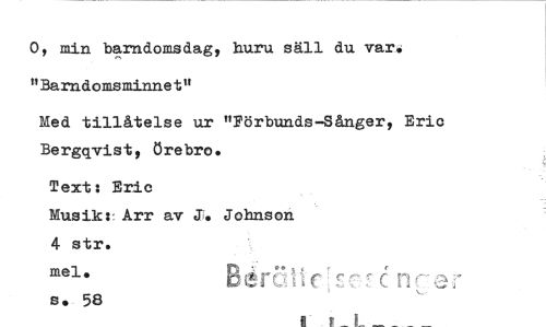 //// 0, min barndomsdag, huru säll du var. "Barndomeminnet" //// Med tillåtelse ur "Förbunds-Sånger, Eric Bergqvist, Örebro. //// Texts Eric //// Musik: Arr av Je Johnson //// 4 strö //// mei. //// B.- 58 //// L _ ////