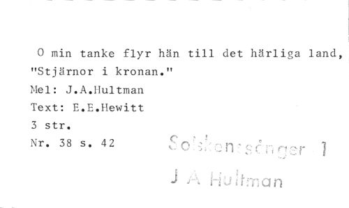 //// 0 min tanke flyr hän till det härliga land, //// "Stjärnor i kronan." //// Mel: J.A.Hultman //// Text: E.E.Hewitt //// 3 str. //// Nr. 38 s. 42 • _f1 //// Rr, //// 1--lud-f-n Q il ////