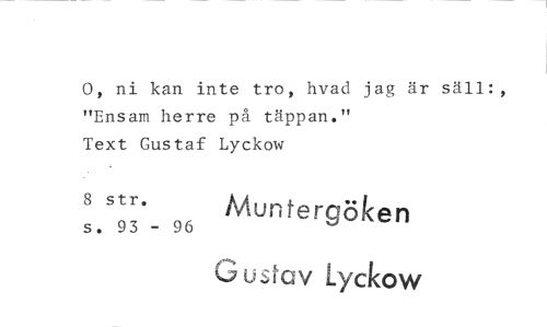 //// 0, ni kan inte tro, hvad jag är säll:, "Ensam herre på täppan." Text Gustaf Lyckow //// 8 str. Munter Eken //// s. 93 - 96 G uz;i.av Lyckow ////