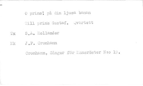 //// 0 prins: på din ljusa banan _'ill prins Gustaf. .,Arartett //// Tx S.A. hollander //// Lk J.P. Cronhamn //// Cronhamn, Sånger för Lansröster N:o 15. ////