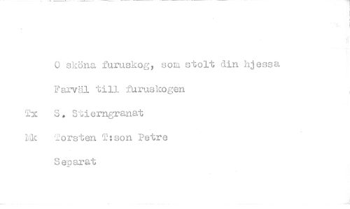 //// o sköna furuskog, som stolt din hjessa //// Farväl till furuskogen //// `ix S. Stierngranat //// Lk Torsten T:son Petra //// Separat ////