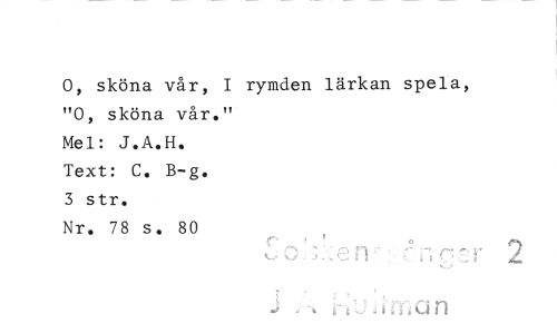 //// 0, sköna vår, I rymden lärkan spela, "0, sköna vår." //// Mel: J.A.H. Text: C. B-g. 3 str. //// Nr. 78 s. 80 ////