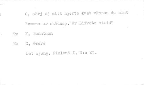 //// 0, sörj ej :gitt hjerta fast vännen du mist //// Romans ur skådesp."Ur LifVets strid" //// Wx F. Berntson //// C. Greve //// Det sjung. Pinland, I. N:o 23. ////