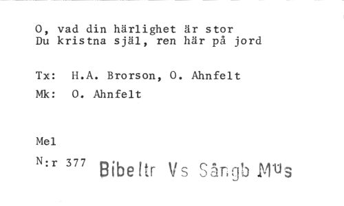 //// 0, vad din härlighet är stor //// Du kristna själ, ren här på jord //// Tx: H.A. Brorson, 0. Ahnfelt Mk: 0. Ahnfelt //// Mel //// N:r 377 //// Bibeftr Sångb DMWs ////