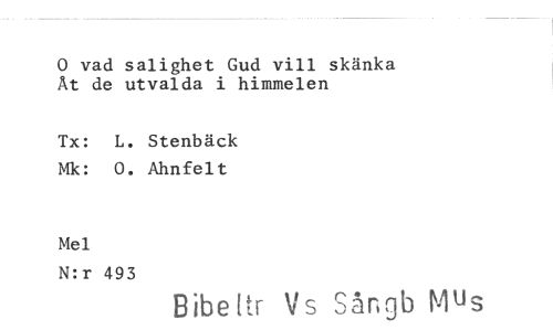 //// 0 vad salighet Gud vill skänka Åt de utvalda i himmelen //// Tx: L. Stenbäck Mk: 0. Ahnfelt //// Mel //// N:r 493 //// Bibettr Vs Sångb Mus ////