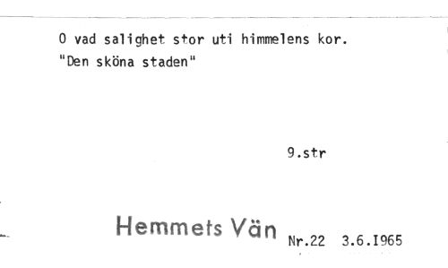 //// 0 vad salighet stor uti himmelens kor. "Den sköna staden" //// 9.str //// Hemmets Vän Nr.22 3.6.1965 ////