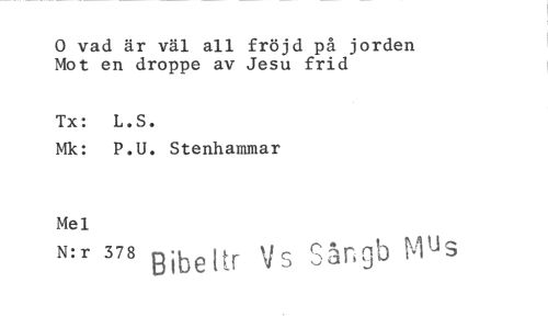 //// 0 vad är väl all fröjd på jorden Mot en droppe av Jesu frid //// Tx: L.S. //// Mk: P.U. Stenhammar //// Mel Ungb Mus //// N:r 378 //// Bibel r ////