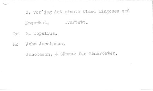 //// 0, vor'jag det minsta bland lingonen små //// lathet, //// Tx Z. Topelius. //// Lk John Jacobsson. //// Jacobsson, 4 Sånger för Lansröster, ////