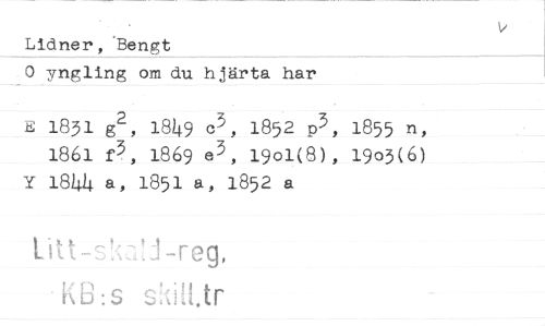 //// Lidner, 'Bengt //// 0 yngling om du hjärta har //// E 1831 g2, 1849 c3, 1852 p3, 1855 /11 //// 1861 f3, 1869 e3, 19o1(8), 19o3(6) //// Y 1844 a, 1851 a, 1852 a //// Lir -'1 reg, //// M.S:s s:;i ,tr ////