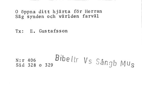 //// 0 öppna ditt hjärta för Herran Säg synden och världen farväl //// Tx: E. Gustafsson //// N:r 406 Bibeitr Vs Sångb Mus //// Sid 328 o 329 ////