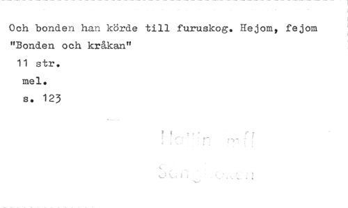 //// Och bonden han körde till furuskog. Hejom, fejom //// "Bonden och kråkan" //// 11 str. //// mel. //// s. 123 ////