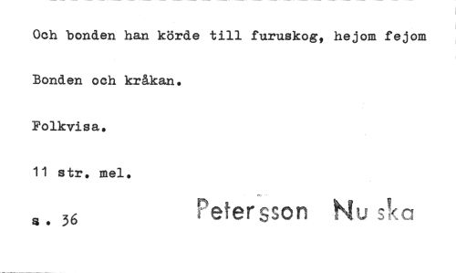 //// Och bonden han körde till furuskog, hejom fejom Bonden och kråkan. //// Folkvisa. //// 11 str. mel. //// . 36 Petersson Nu ////