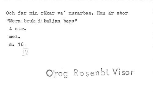 //// Och far min råkar va' murarbas. Han är stor //// "Mera bruk.i baljan boys" //// 4 str. //// mel. //// si. 16. //// IV //// 0:rog RoenbL Vi sor ////