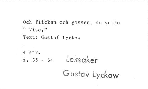 //// Och flickan och gossen, de sutto " Visa." //// Text: Gustaf Lyckow //// 4 str. //// s. 53 - 54 Leksaker //// Gustav Lyckow ////