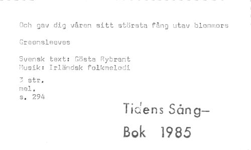 //// Och gav dig våren sitt största fång utav blommors Greensleeves //// Svensk text: Gösta Rybrant Musik: Irländsk folkmelodi //// 3 str. mei. //// s. 294 //// Tics ens Sång— //// Bok 1985 ////