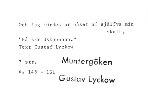//// Och jag kördes ur båset af själfva min //// skatt, //// "På skridskobanan." Text Gustaf Lyckow //// 7 str. Munterg6ken //// s. 148 - 151 //// Gustav Lyckow ////
