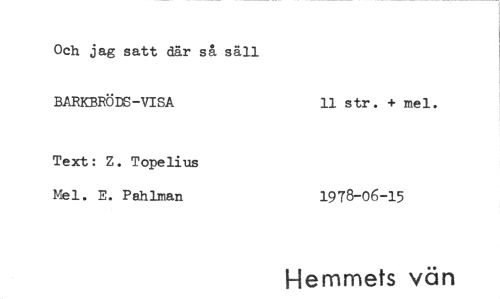 //// Och jag satt där så säll BARKBRÖDS-VISA //// Text: Z. Topelius Mel. E. Pahlman //// 11 str. + mel. //// 1978-06-15 //// Hemmets vän ////