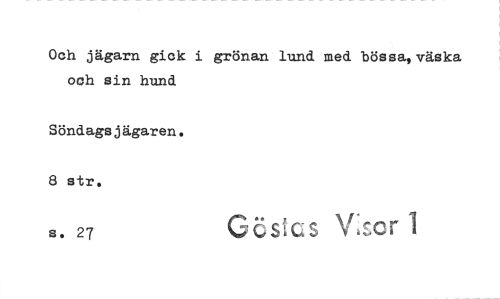 //// Och jägarn gick i grönan lund med bössa, väska och sin hund. //// Söndagsjägaren. 8 str. G C j y //// s. 27 Ni' , I ////