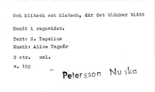 //// Och klitsch och klatsch, där det blänker blått Hemåt i. regnväder. //// Text: Z. Topelius Musik: Alice Tegndr //// 2 str. mel. //// e. 102 Peter son Nu ska ////