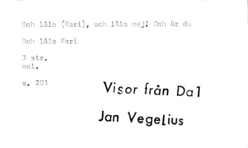 //// Och låla (Kari), och låla mej: Och är du Och låla Kari //// 3 str, mel. //// s. 201 Visor från Da l //// Jan Ve gel ius ////