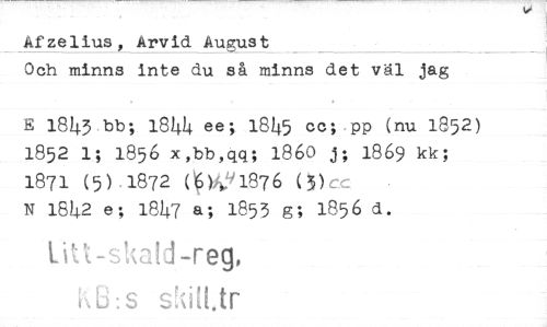 //// Afzelius, Arvid August _ //// Och minns inte du så minns det väl jag //// E 1843 bb; 1844 ee; 1845 cc; PP (nu 1852) 1852 1; 1856 x,bb,qq; 1860 j; 1869 kk; //// 1871 (5) 1872 (01171876 (5) //// N 1842 e; leta a; 1853 g; 1856 d. //// lat-shid-reg, //// 13:s skia.tr ////