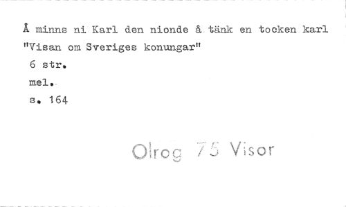//// Å minns ni Karl den nionde å tänk en tocken karl //// "Visan om Sveriges konungar" //// 6 str, //// mel., //// s. 164 //// ro c 7L Visor ////