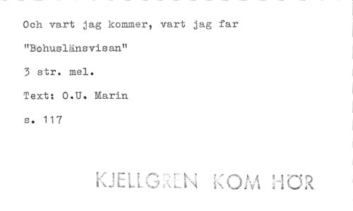 //// Och vart jag kommer, vart jag far //// "BOhuslänsvisann //// 3 str. mel. //// Text: O.U. Marin //// s. 117 ////