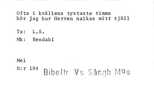//// Ofta i kvällens tystaste timma hör jag hur Herren nalkas mitt tjäll //// Tx: L.S. //// Mk: Rendahl //// Mel //// N:r 194 Bibeltr Vs Sångb Mus ////