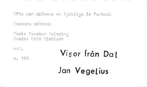 //// Ofta man drömmer om lyckliga år fantasi Mormors drömbok //// Text: Torsten Palmring Musik: Erik Vikbladh //// mei, s, 105 Visor från Dat //// Jan Vegelius ////