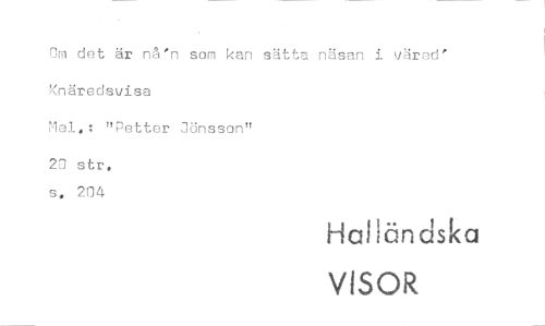 //// Om det är nä'n som kan sätta näsan i vred' Knäredsvisa //// Mei.: "Petter Jönsson" //// 20 str. s. 204 //// Haliändska //// VISOR ////