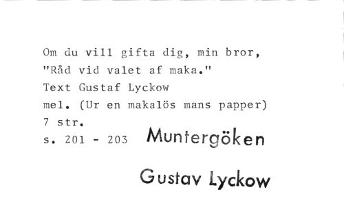 //// Om du vill gifta dig, min bror, "Råd vid valet af maka." //// Text Gustaf Lyckow //// mel. (Ur en makalös mans papper) 7 str. //// s. 201 - 203 Muntergöken //// Gustav Lyckow ////