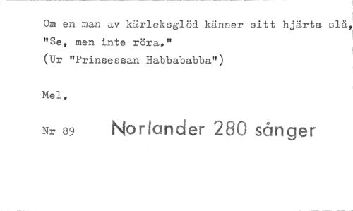 //// Om en man av kärleksglöd känner sitt hjärta "Se, men inte röra." //// (Ur "Prinsessan Habbababba") //// Mel. //// Nr 89 Norlander 280 sånger ////