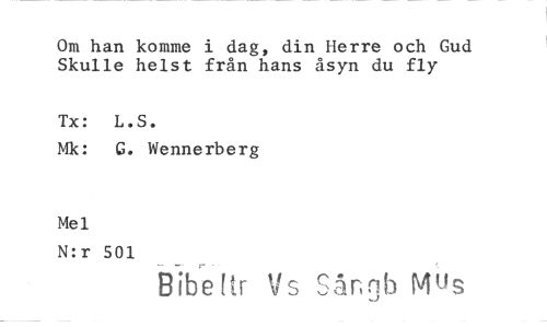 //// Om han komme i dag, din Herre och Gud Skulle helst från hans åsyn du fly //// Tx: L.S. //// Mk: G. Wennerberg //// Mel //// N:r 501 //// Bibeltr Vs Sångb M s ////