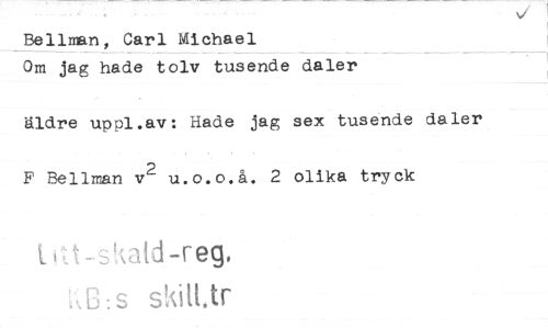 //// Bellman, Carl Michael //// Om jag hade tolv tusende daler //// äldre uppl.av: Hade jag sex tusende daler F Bellman v2 u.o.o.å. 2 olika tryck //// t-skatd-reg, //// ,C:s skilt tr ////